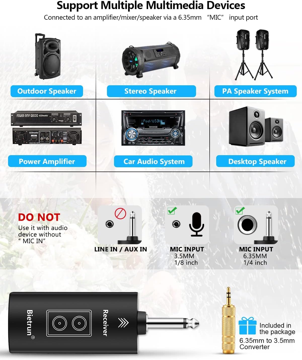 Easy to Use:●Plug and play, no need to pair, long press the “PWR·VOL” button to turn on the microphone. Only for input devices with 6.35mm (1/4″) or 3.5mm (1/8″) MIC port, E.g speaker, Singing machine, audio amplifier, PA system, Voice amplifier, truck speaker system, Dome speaker system etc. ●Receiver with Bluetooth.Turn on the receiver and insert it into your audio device, search for the Bluetooth name: Bietrun, Play your music for karaoke.