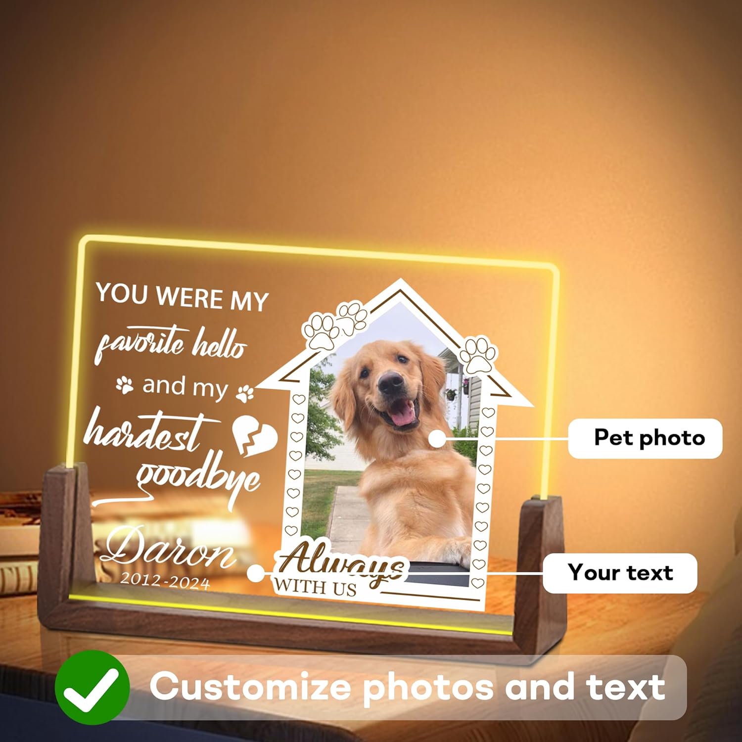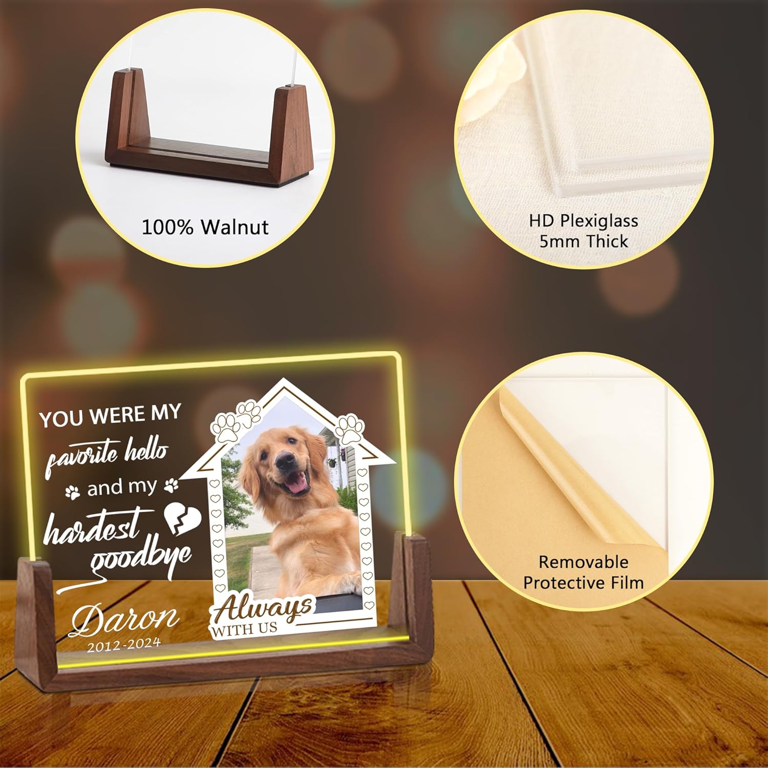 Pet Loss Sympathy Gift High-quality Materials and HD Printing: The pet memorial night light is made of 5mm thickened transparent acrylic plate and a solid walnut base. The acrylic light plate uses UV high-definition printing technology, the content and texture are clearly visible, the color is bright, and it does not fade. The base uses a USB interface power cord and LED light display, which looks beautiful and elegant.