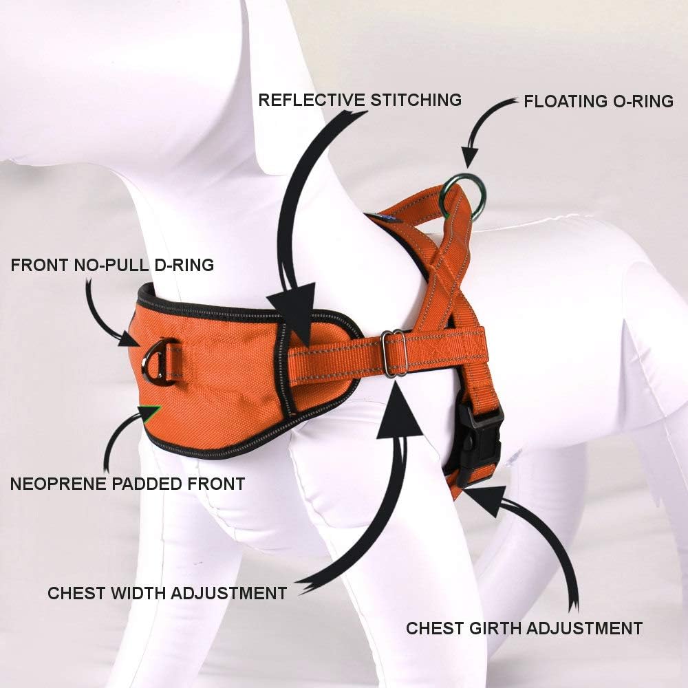 The harness has 2 adjustment points for the chest girth and chest width. Most other harnesses have a fixed chest width making them fit awkwardly. The harness also has a front D-ring making it a no-pull harness also. Features: