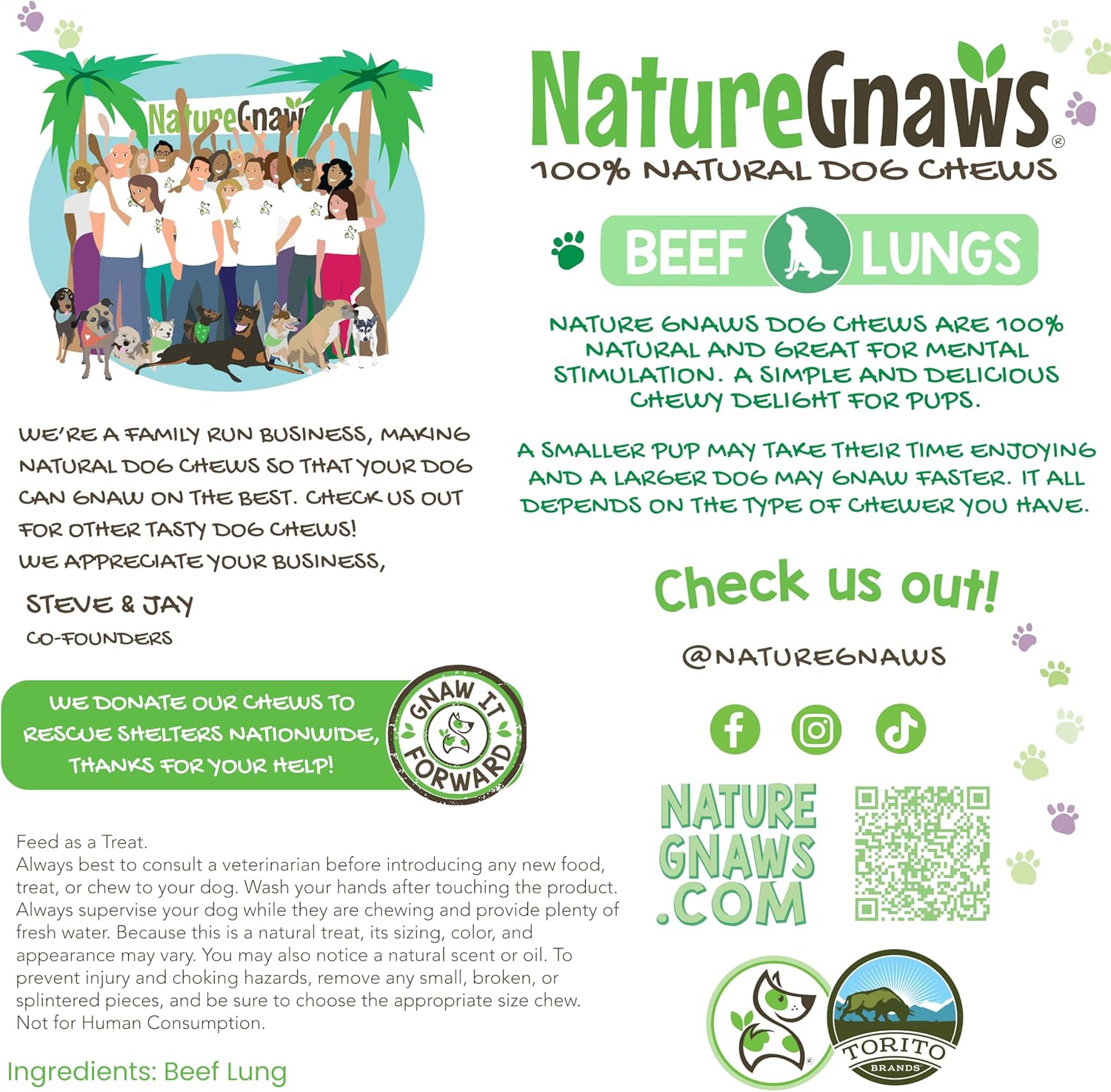 Made with natural premium quality beef lung our Beef Lung Filets are ideal to keep your beloved pup busy and calm. These Beef Lung Filets are perfect for teething puppies and light chewers of all sizes. RAWHIDE-FREE CHEWS – Nature Gnaws USA Beef Lung Filets are low-odor, grain-free and gluten-free, making them the perfect alternative to rawhide sticks and manufactured dog bones. NATURAL DENTAL CHEWS – Soft and savory, the natural act of chewing our Beef Lung Chews helps reduce plaque and tartar for cleaner teeth and fresher breath. Promoting overall good dental hygiene, these natural chews for dogs will keep your pet busy and satisfied. SIMPLE, NATURAL, DELICIOUS – Our Beef Lung have a savory thick texture that is the perfect reward treat to occupy and entertain. Your dog will love the natural scent and tasty beef flavor of our natural chews. NATURE GNAWS – As a family-run business, we are dedicated to providing 100% natural dog chews, bully sticks and treats made with responsibly sourced ingredients to ensure they are the best simple, natural, and delicious products for your beloved pups.