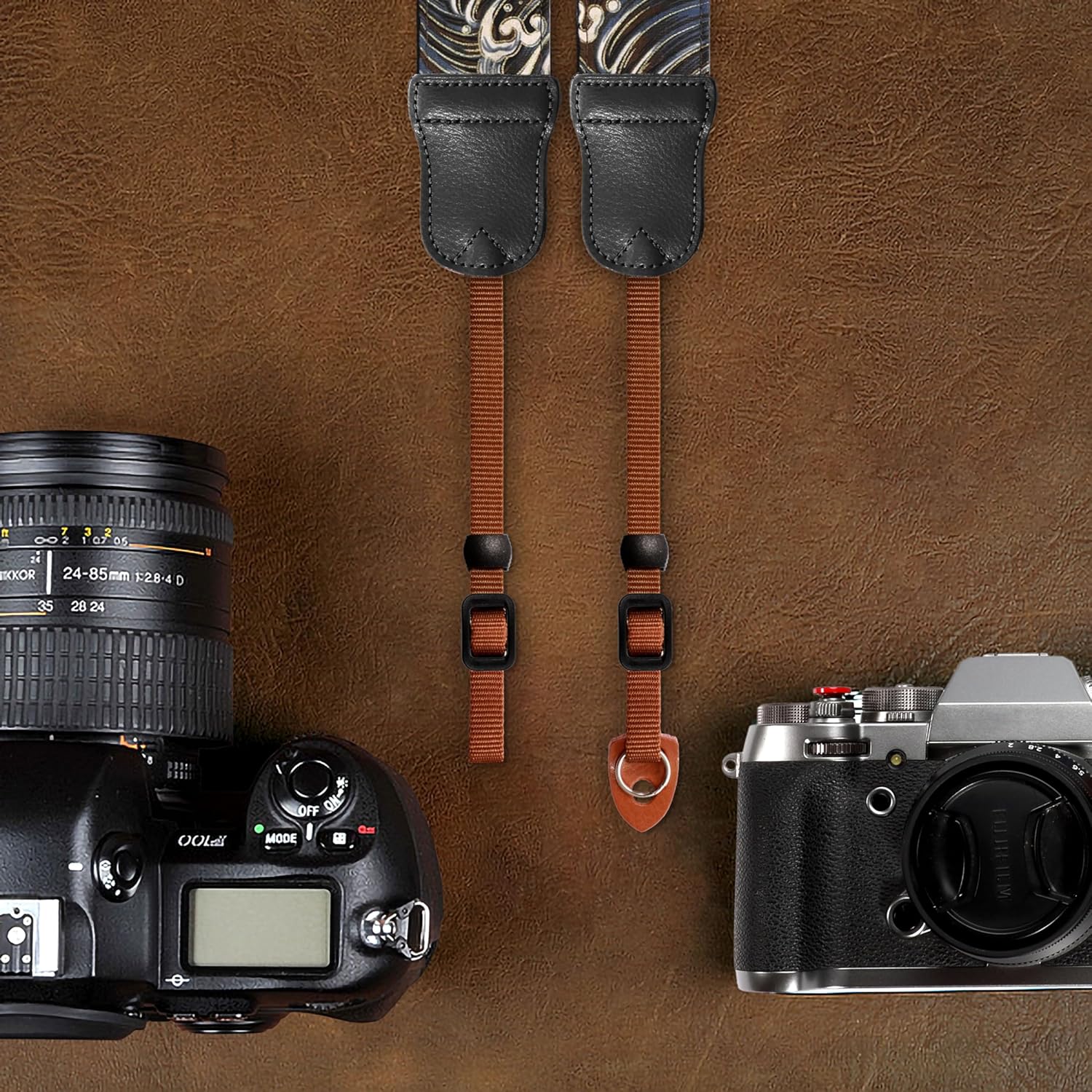Padwa Lifestyle Camera Strap – 2″ Cowhide Leather Head Cotton Camera Straps for Photographers,Vintage Japanese Art Print Adjustable Neck & Shoulder Strap for ALL DSLR/SLR Cameras(Brown Wave)